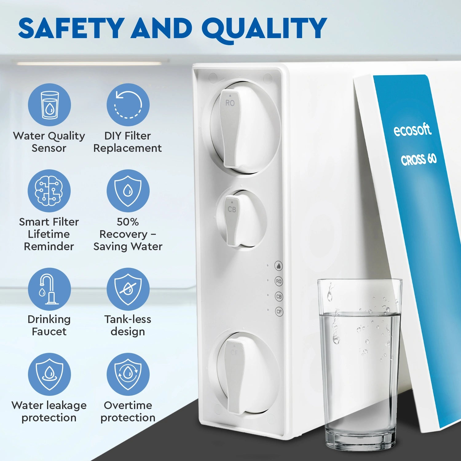 The Ecosoft CROSS 60 is a smart and highly efficient direct flow Reverse Osmosis (RO) system designed to provide ultra-pure drinking water on demand for modern households. Its compact, tankless design is an ideal solution for under-sink installation, saving significant kitchen space compared to traditional RO systems.