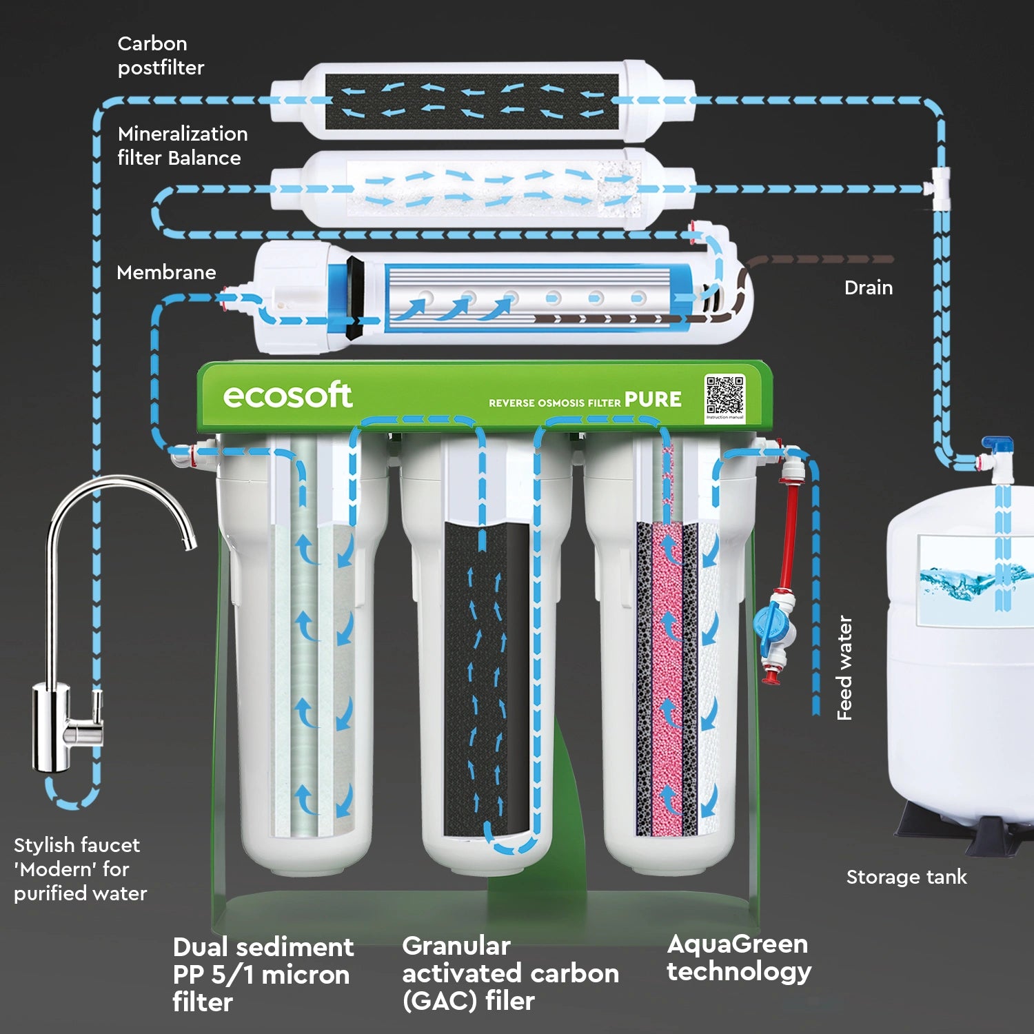 | Filtration stages | Sediment, activated carbon, AquaGreen pre-treatment, RO membrane, balance remineralization, post-carbon |